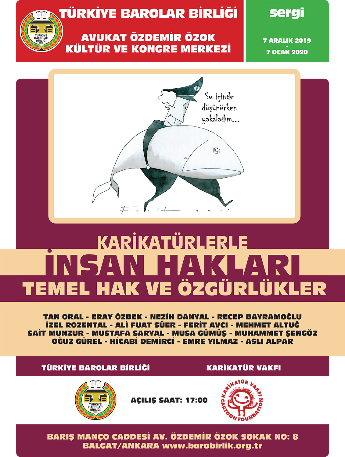İnsan Hakları Karikatür Sergisi Türkiye Barolar Birliği ve Karikatür Vakfı tarafından bu sene 14. kez düzenlenecek. Bu sene konusu Temel Hak ve Özgürlükler olarak belirlenen sergi Türkiye’nin önde gelen karikatüristlerinin 48 çalışmasından oluşuyor. 7 Aralık saat: 17:00’de Ankara’da bulunan Türkiye Barolar Birliği binasında açılışını yapacak olan sergiye tüm sanatseverler davetlidir.